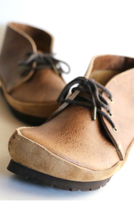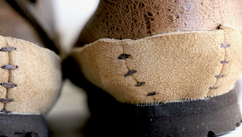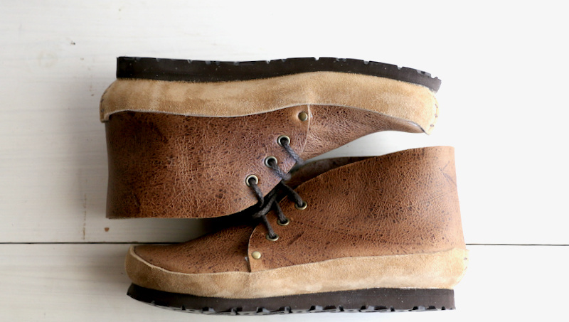 本作のアッパーのデザイン・モチーフはアメカジ。少しタイトに合わせたリーバイス501をロールアップし、靴下を見せながら履くとハマりそうなチャッカブーツ。ブーツといっても丈は程よく短めにすっきりとさせ、履口は広くフィッティングは良好。また側面から見えるシャープさと、上から見える少し間の抜けた顔立ちとのギャップは、古き良きアメリカを彷彿とさせるデザインへのオマージュと、ブランドの遊び心がフィットしている部分かもしれません。さらに何といっても極め付けは、“あのミッドソール”。原始的なギャートル・ソールと、アメカジベースのデザインとのミクスチャーが本作の醍醐味となっています。