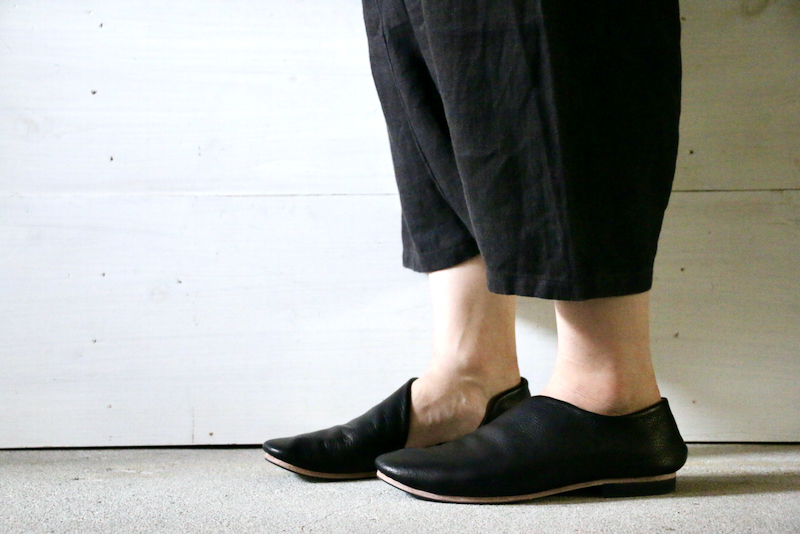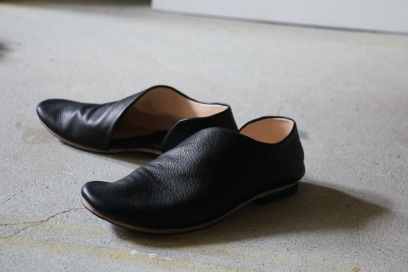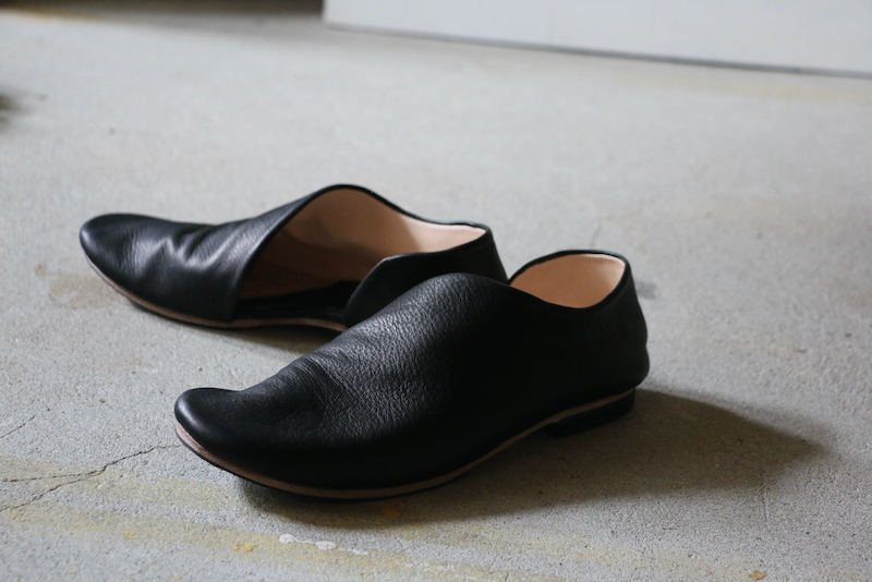1枚の革で覆われたアッパーのデザインは、内側の土踏まずから踵にかけて、緩やかな曲線を描きます。内側に折り畳まれたアッパーの切り口。縫い目のないその線はあいまいで、穏やかな印象になるように。これは柔らかく、しなやかな革の質感を一層ひきたたすための細工。一枚の革を纏う(まとう)。そのシンプルな佇まいを足もとに。