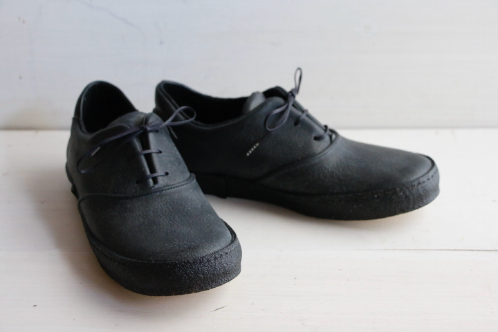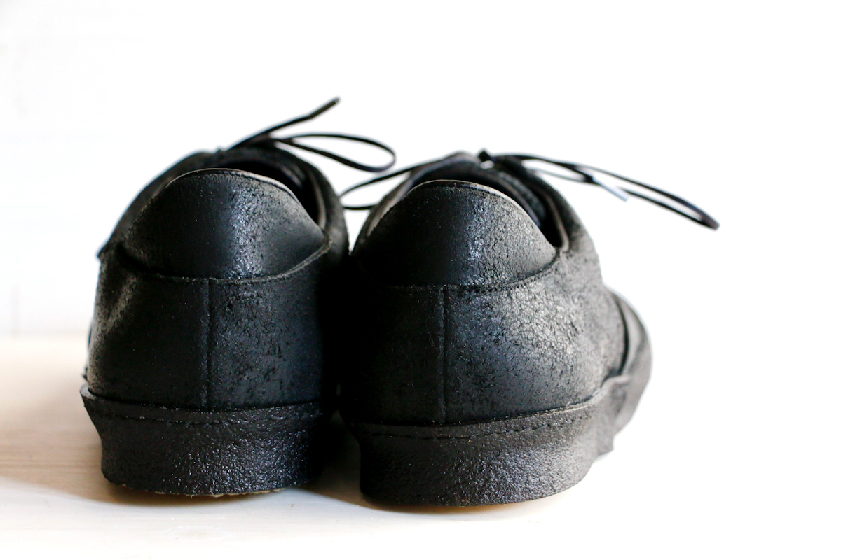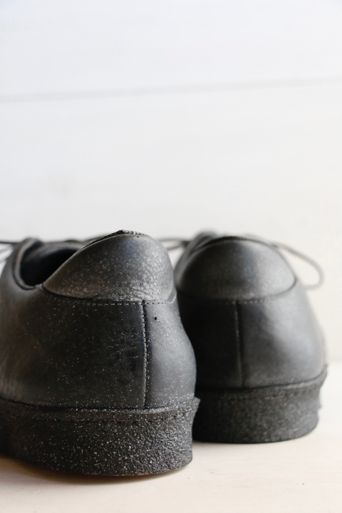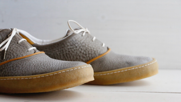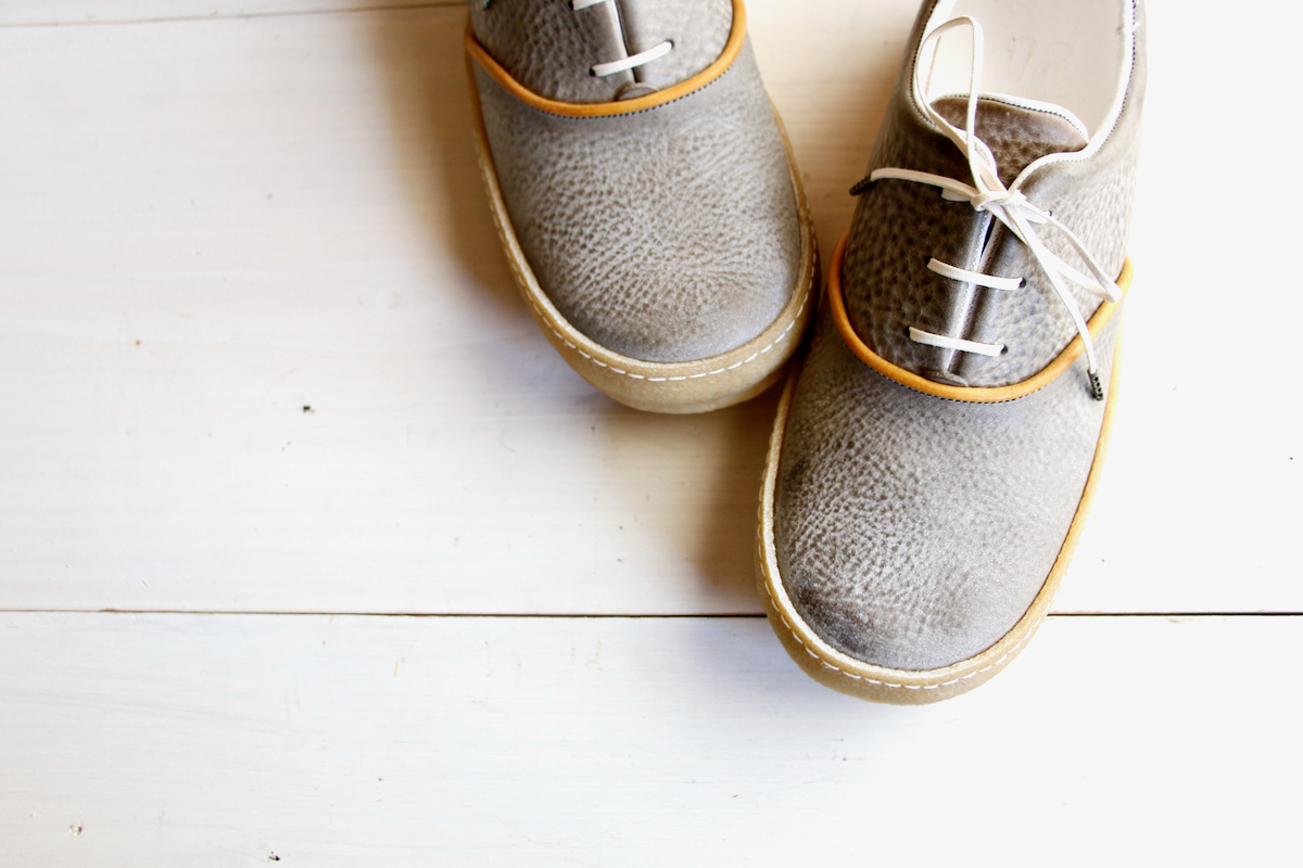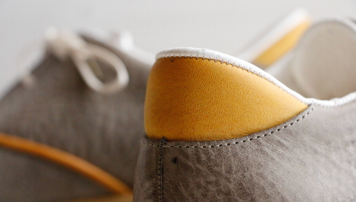 革靴の作りをしながら、見た目はスニーカー。履き心地は極めてコンフォータブル。今回はアラスカ・レザーを使用して作られたサンプルが並びます。リペアをしながら長く履けるスニーカーのエイジングに期待。パーツごとに様々なカラーでオーダーください。35000円+税から。