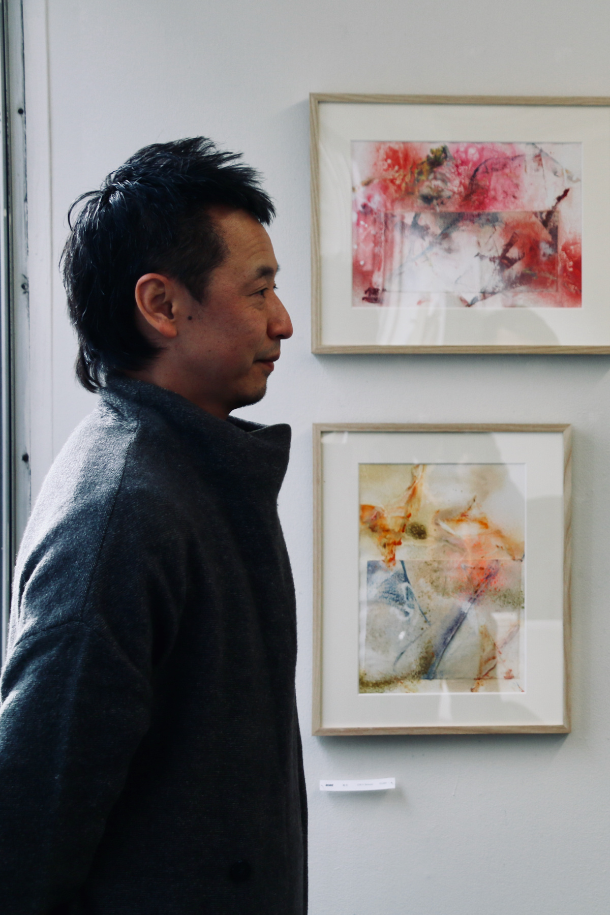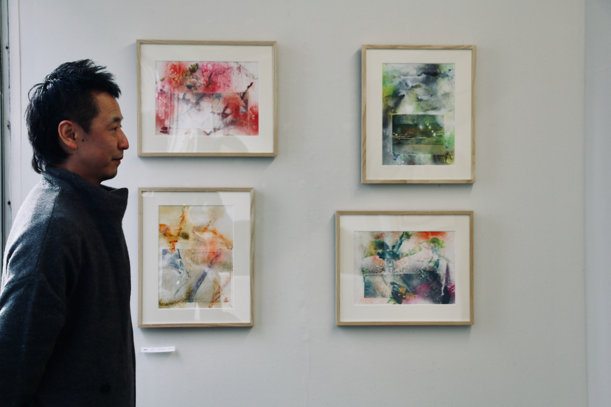 その線はゆっくりと ”なにか” を取り込みながら、うねるように進む。音もなく、感情もなく、それはただ在るべくしてそこに在るような、でも決してネガティブではない、なんともいい難い感覚を内包しているように、私には見える。いつか出会った日、そこに絵はなかったが、彼の周りには、同じように ”なにか” が渦を巻いていた。