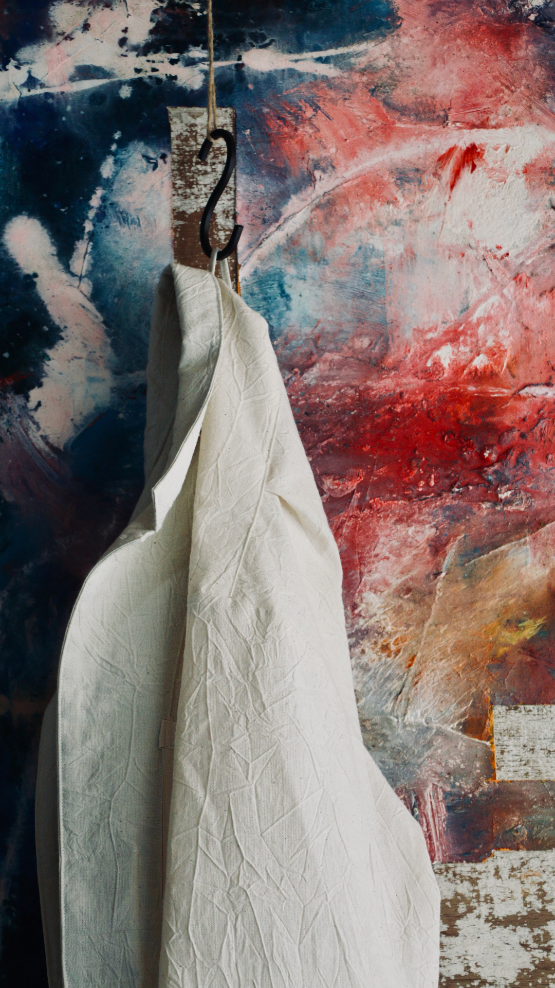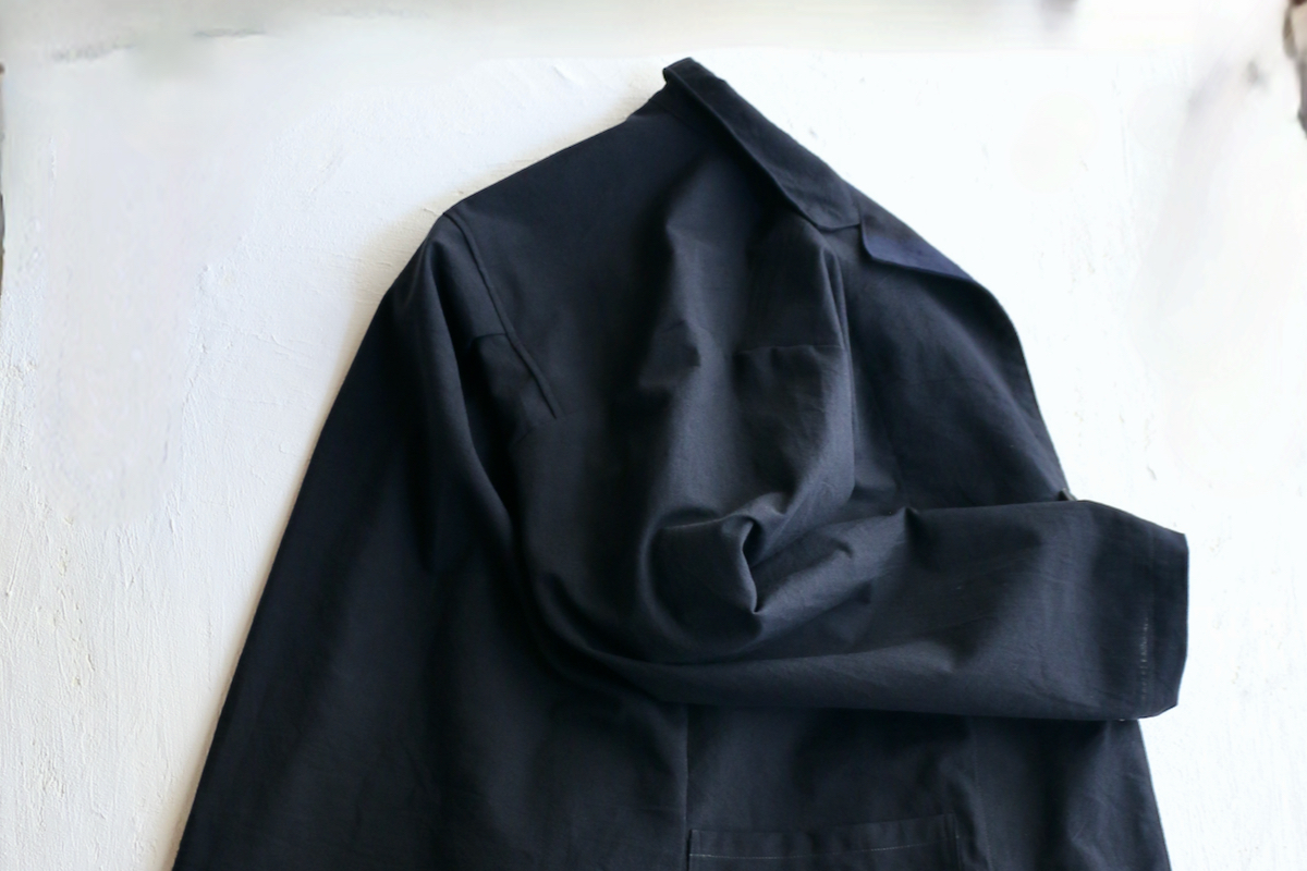佐藤氏と創ったのは、靴職人のアトリエコート。歴史ある生地、亀田縞をたっぷりと使い出来上がったそれは、風をはらみ優しく揺れ、使い込む度に風合いを増します。サイズを選びお好みの色素材でオーダーください。