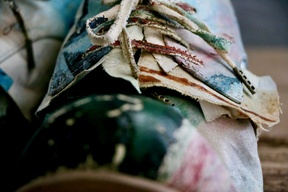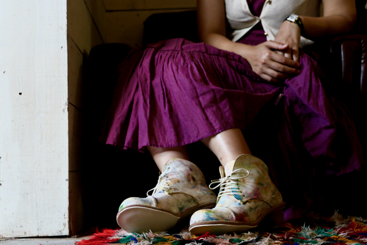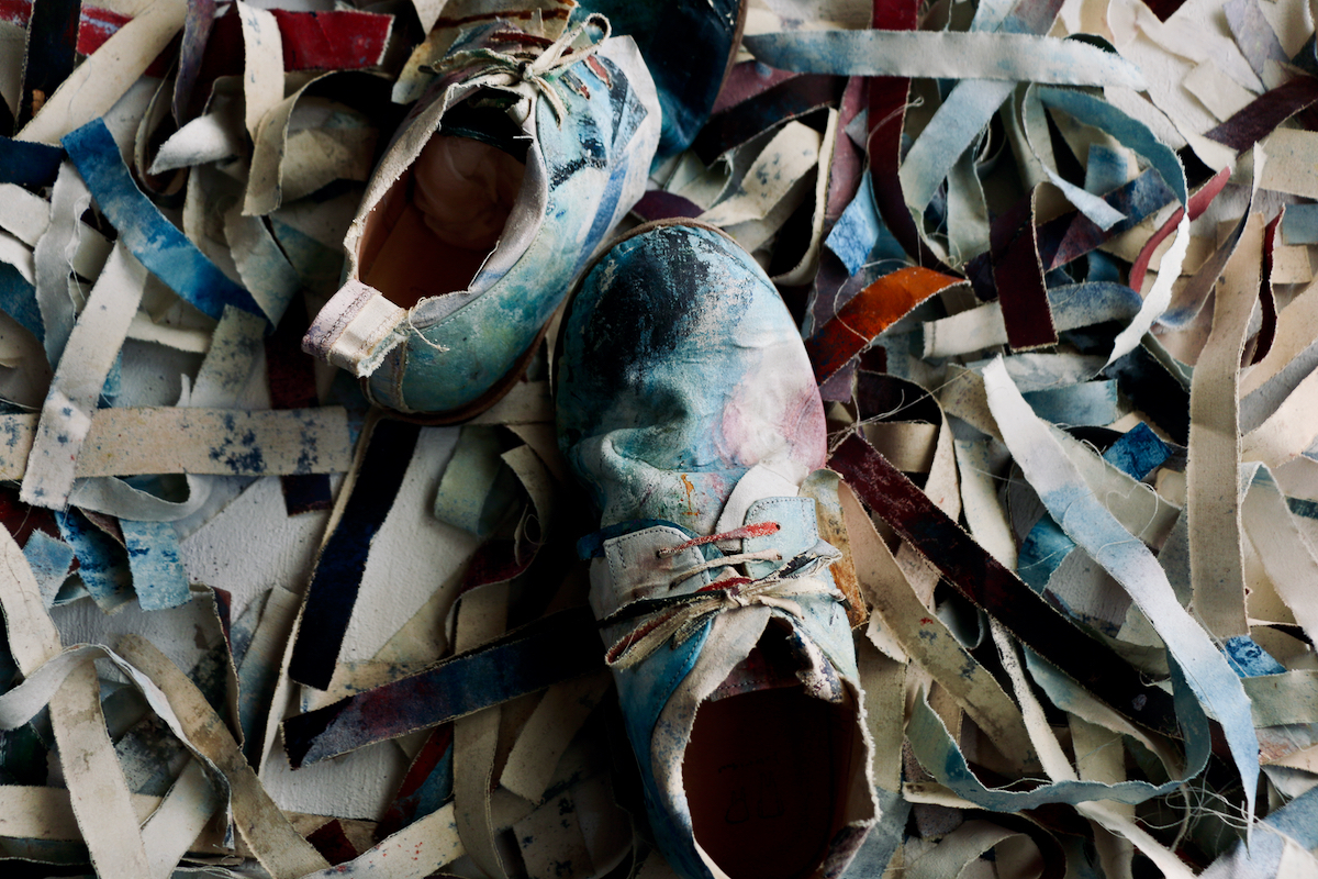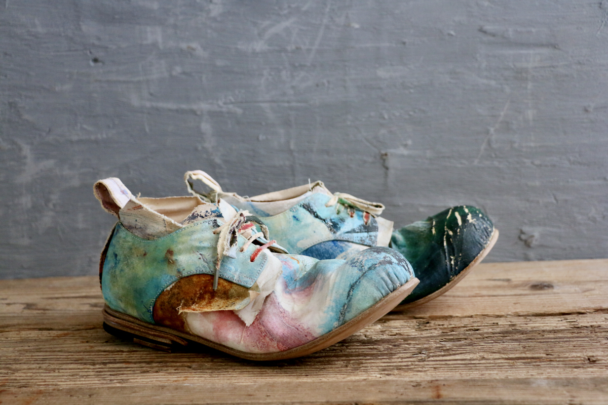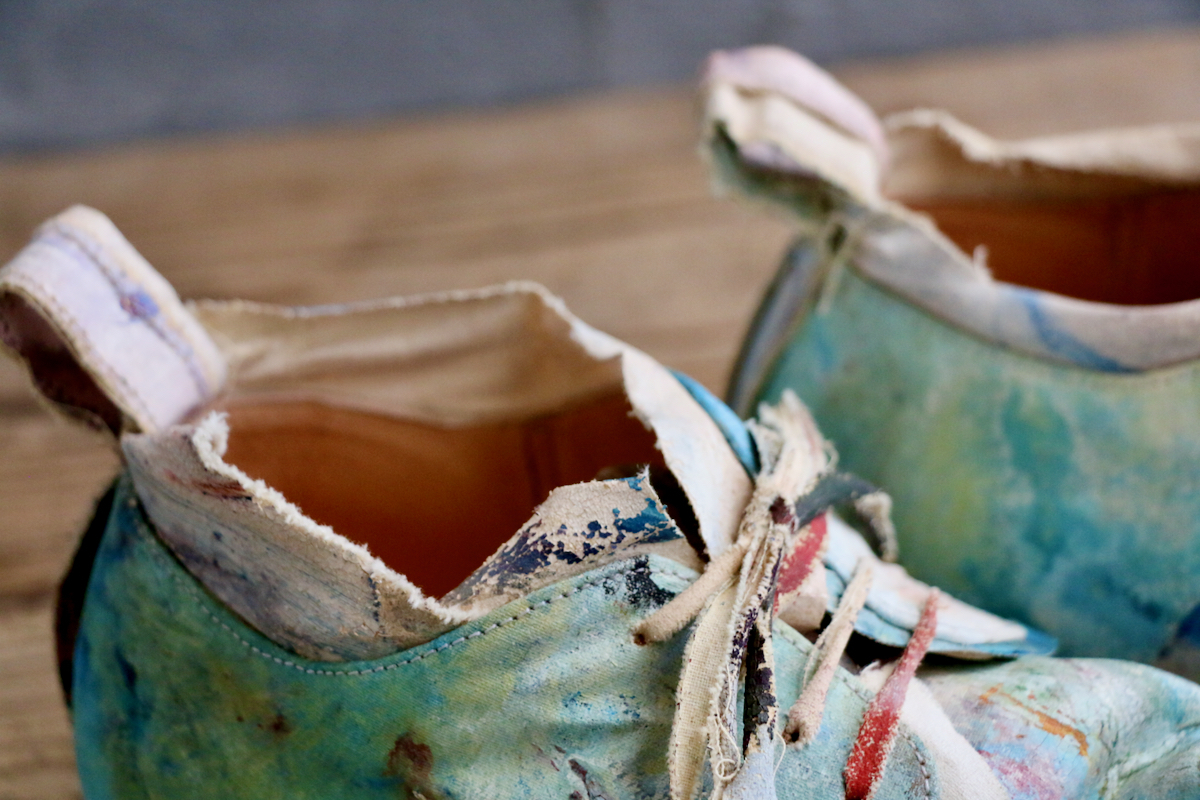 現代画家・伊吹拓氏とのコラボレーション・シューズを制作しました。キャンバスから剥ぎ取った彼の”過去”を繋ぎ合わせ、私なりに伊吹拓を再構築しました。制作途中、生地を合わせながら、その作品の力に吸い寄せられるようで、意識を失いそうになりました。それはまるで安いドラマを見ているようで、こんなこともあるものだと一人、工房で大笑いしたのは記憶に新しい出来事です。