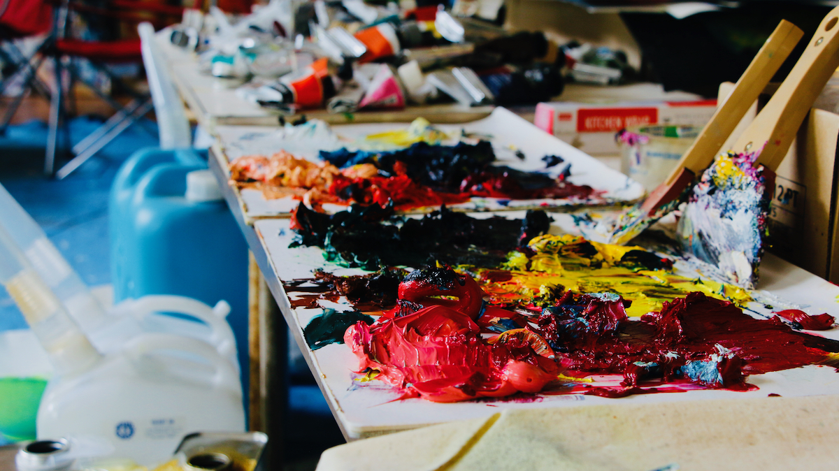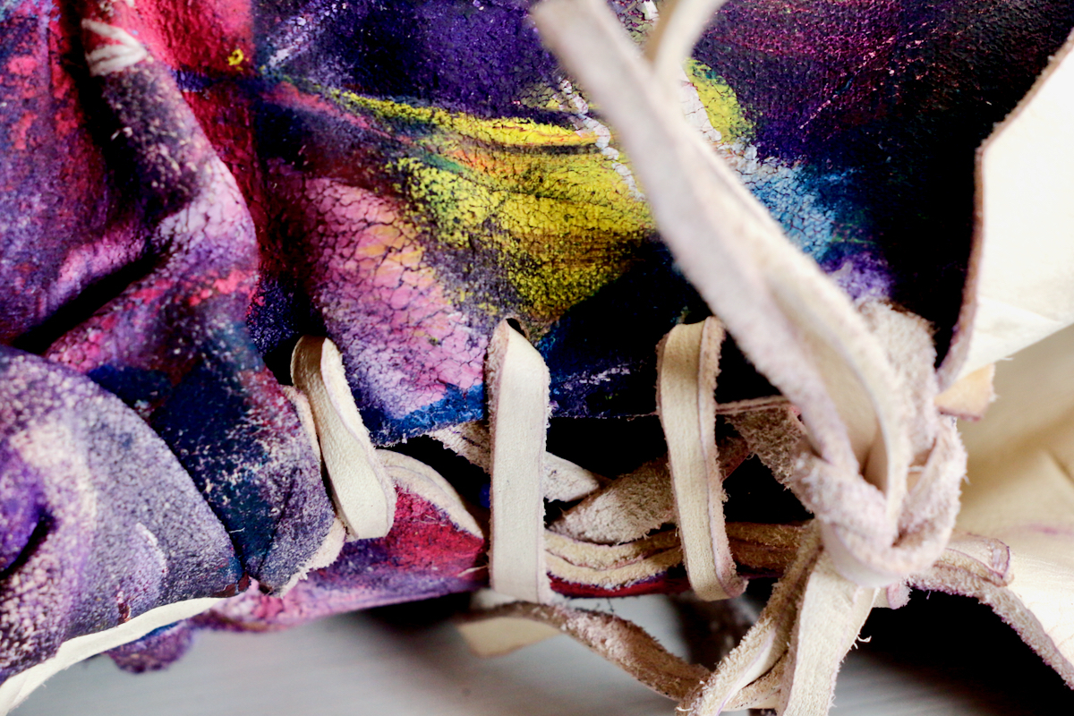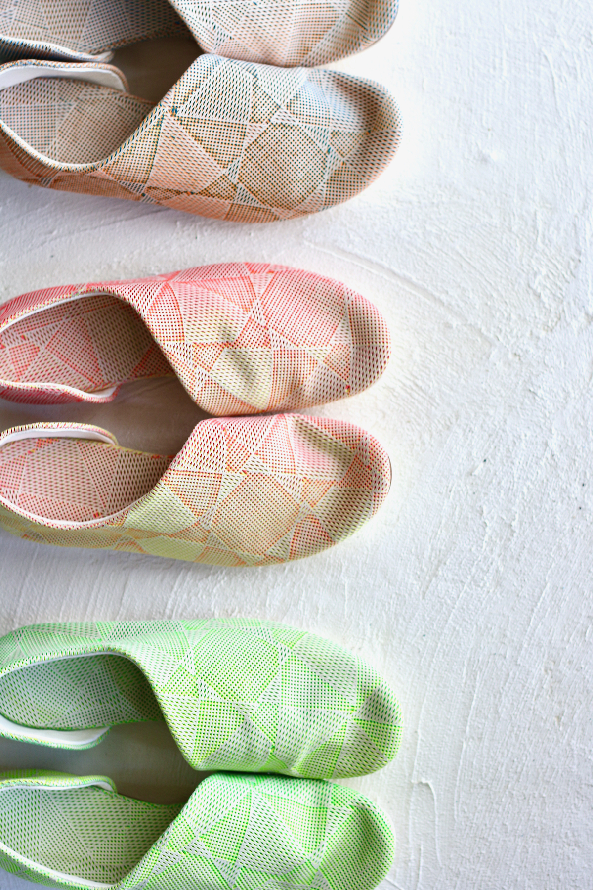 そんな伊吹さん。過去の画面を縦横に剥がして色面を創出し、そこに色彩を載せて作品を再構築する作風で、時間軸さえ味方につけてしまった。今回はその剥がした画面を用い靴へ。創作しながら窒息するかと思うほど引寄せられた絵の力を生で体感ください。
