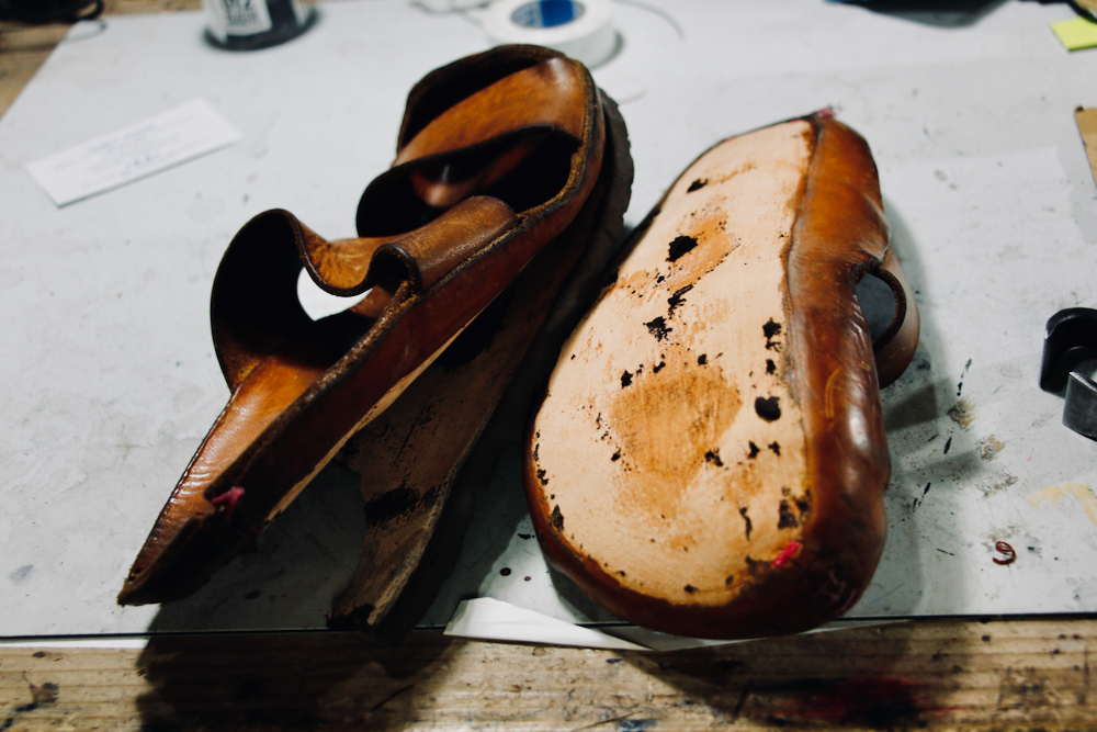 本製品に使用される革の割合はおよそ95%を占めます。(残りの5%はソールや手縫の紐など)。そのうちの約50%はアッパーのパーツに。残り約50%はソールやヒールといった底周りのパーツに分けられます。すべてのパーツに使用される革は吸排出性に富み、汗を吸いやすい性質を持っています。