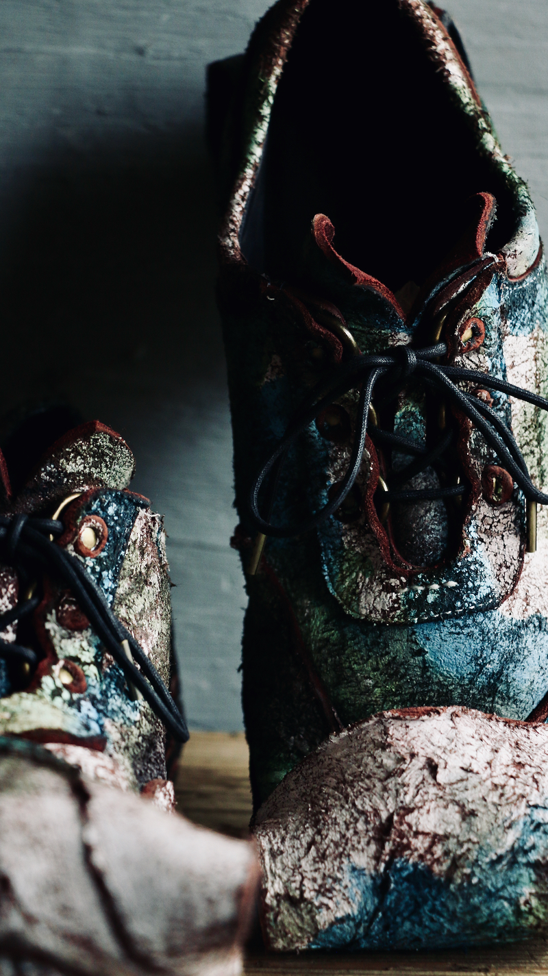“景色”を革靴に投影すべく、新しく出来上がったマテリアルに“ジオラマ”、曲がりくねったソールには“地球”(テラ・ソール)と名付けました。創作の進行中は、革靴ではなくジオラマを作っているような、鷹になり滑空をしながらそれを眺めているような、今まで体験したことのない不思議な感覚が常に宿っていたような気がします。