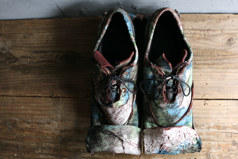 パーツごとに重なるアッパーのいびつな曲線は地形のよう。折り曲げられたヒールと、天に向かいながら翻るトゥは大地の突起を連想させる。アッパーに使用した素材はニベ。革の裏側の肉に程近い部位が故、繊維は粗く毛羽立ちが不均一なのが特徴だ。