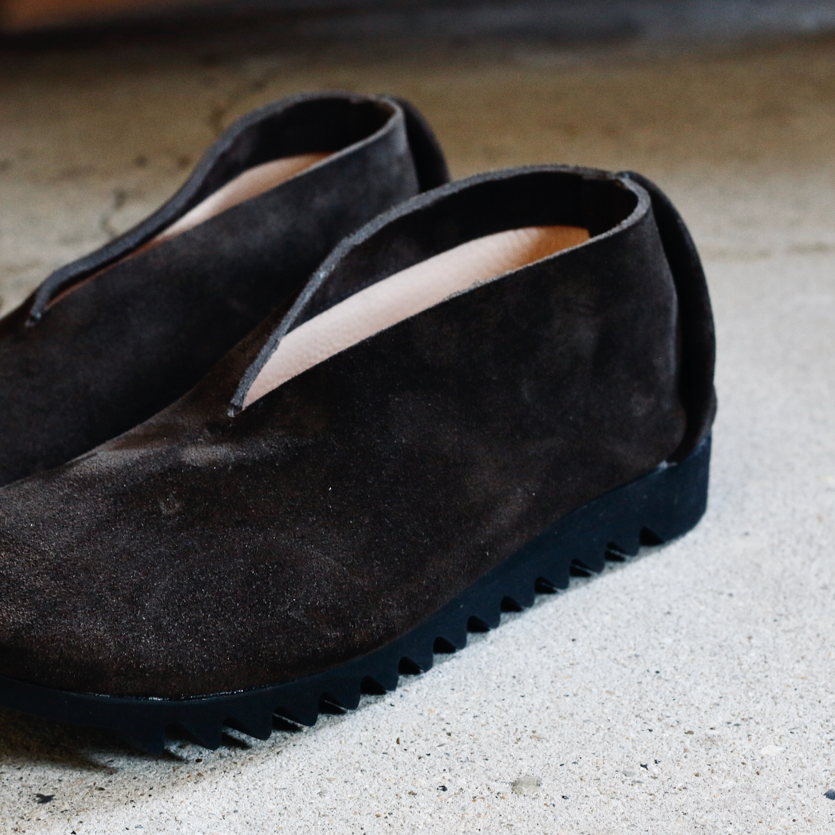 デザインの要は、1枚の革で作られたアッパー。つま先から甲までのミニマルなデザイン。そこに相対するようにある、折り畳まれた、かかとの膨らみが、デザインにスパイスを与えます。
