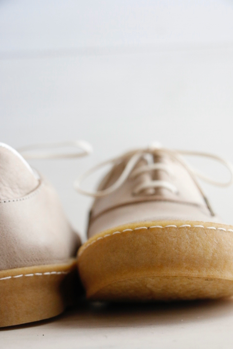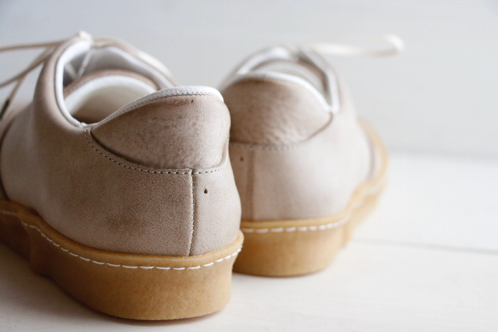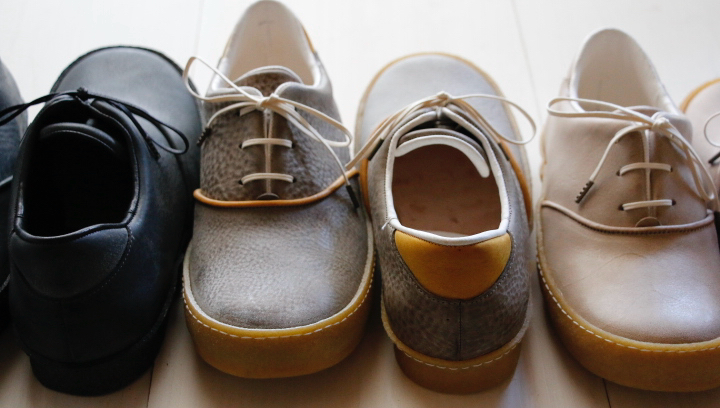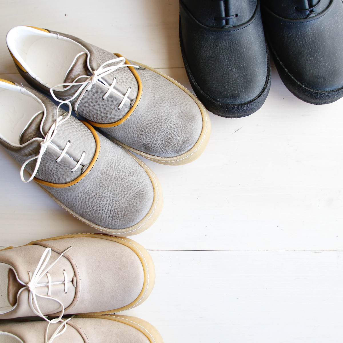 革靴の作りをしながら、見た目はスニーカー。履き心地は極めてコンフォータブル。今回はアラスカ・レザーを使用して作られたサンプルが並びます。リペアをしながら長く履けるスニーカーのエイジングに期待。パーツごとに様々なカラーでオーダーください。35000円+税から。