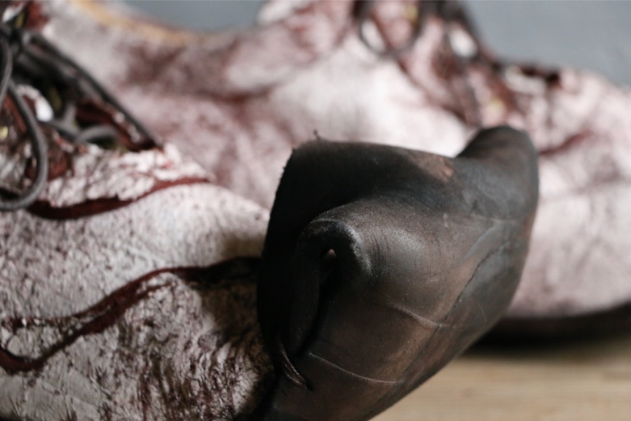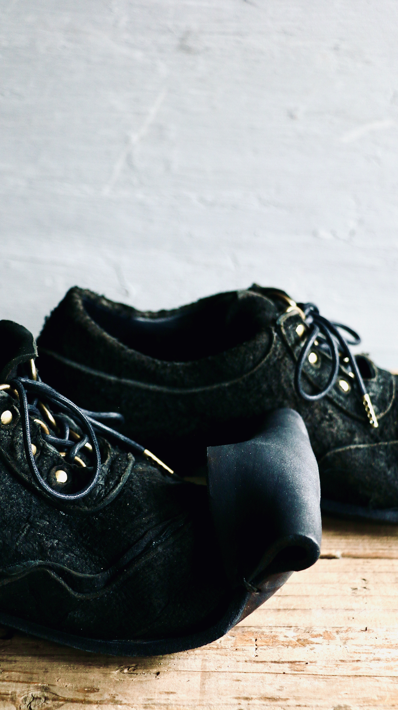 パーツごとに重なるアッパーのいびつな曲線は地形のよう。折り曲げられたヒールと、天に向かいながら翻るトゥは大地の突起を連想させる。アッパーに使用した素材はニベ。革の裏側の肉に程近い部位が故、繊維は粗く毛羽立ちが不均一なのが特徴だ。