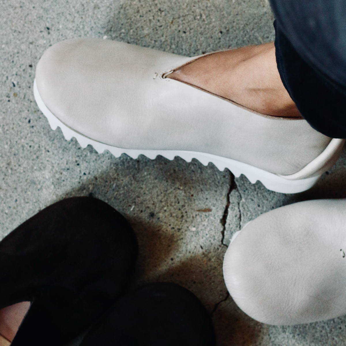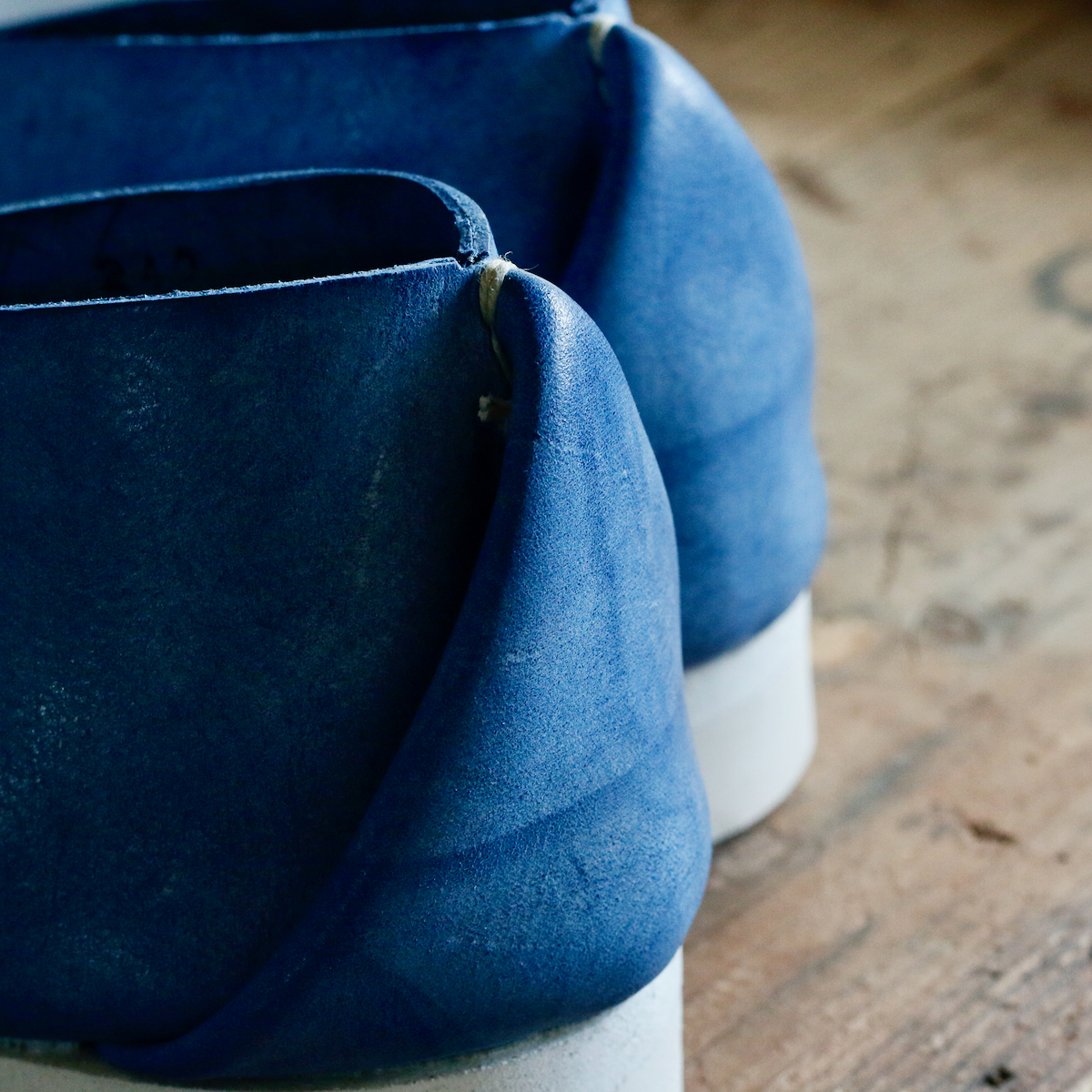 デザインの要は、1枚の革で作られたアッパー。つま先から甲までのミニマルなデザイン。そこに相対するようにある、折り畳まれた、かかとの膨らみが、デザインにスパイスを与えます。