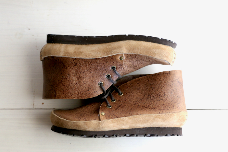 本作のアッパーのデザイン・モチーフはアメカジ。少しタイトに合わせたリーバイス501をロールアップし、靴下を見せながら履くとハマりそうなチャッカブーツ。ブーツといっても丈は程よく短めにすっきりとさせ、履口は広くフィッティングは良好。また側面から見えるシャープさと、上から見える少し間の抜けた顔立ちとのギャップは、古き良きアメリカを彷彿とさせるデザインへのオマージュと、ブランドの遊び心がフィットしている部分かもしれません。さらに何といっても極め付けは、“あのミッドソール”。原始的なギャートル・ソールと、アメカジベースのデザインとのミクスチャーが本作の醍醐味となっています。