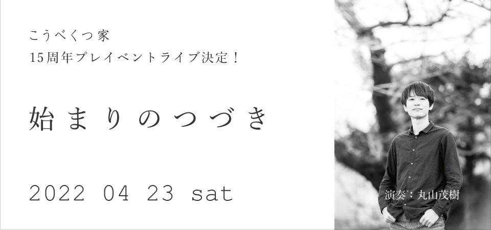 こうべくつ家が15周年を迎える。それに際し工房でのライブを丸山くんに依頼したら、なんと2022年は丸山茂樹の音楽活動20周年イヤーだというではないか。なんという偶然。お互いの節目の年に、また関わり合えることを光栄に思っております。ときに鋭く、そして時に包み込むような。唯一無二。丸山茂樹でしかないあの音の振動を想像し、今から胸躍らせています。丸山くん、20周年おめでとう。そしてこれからも、始まりのつづきを。