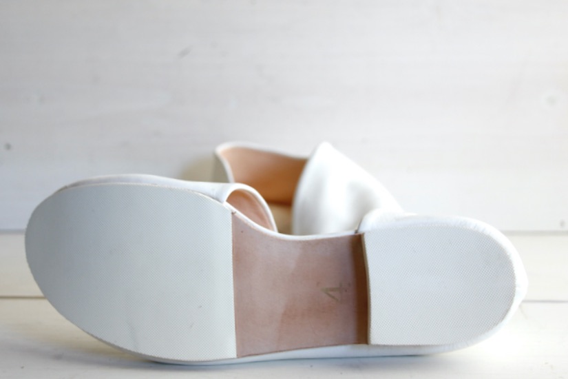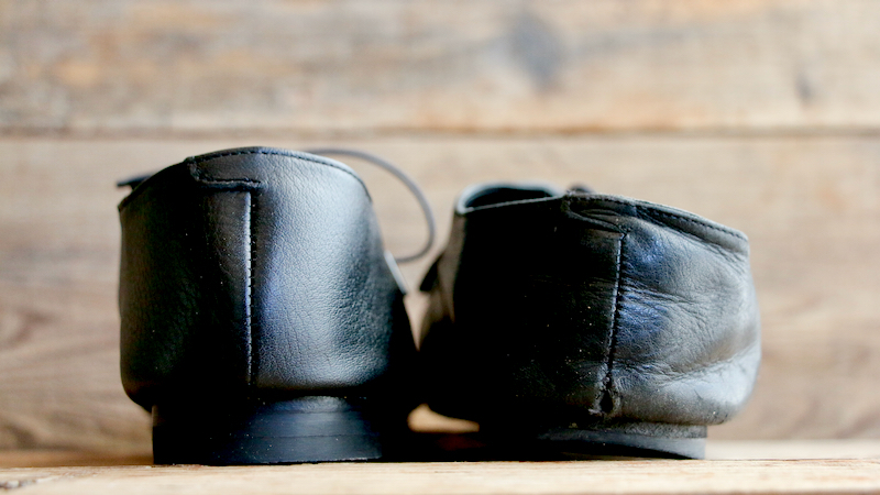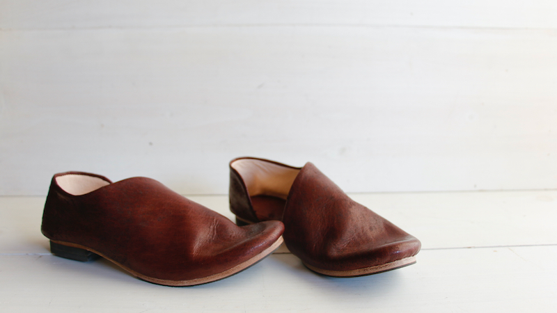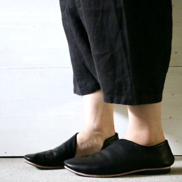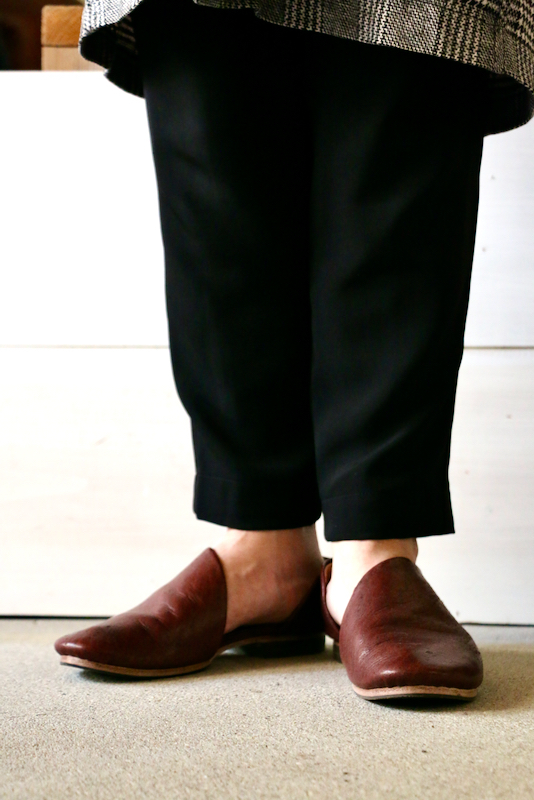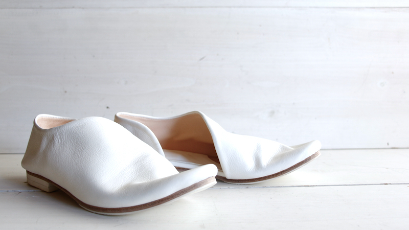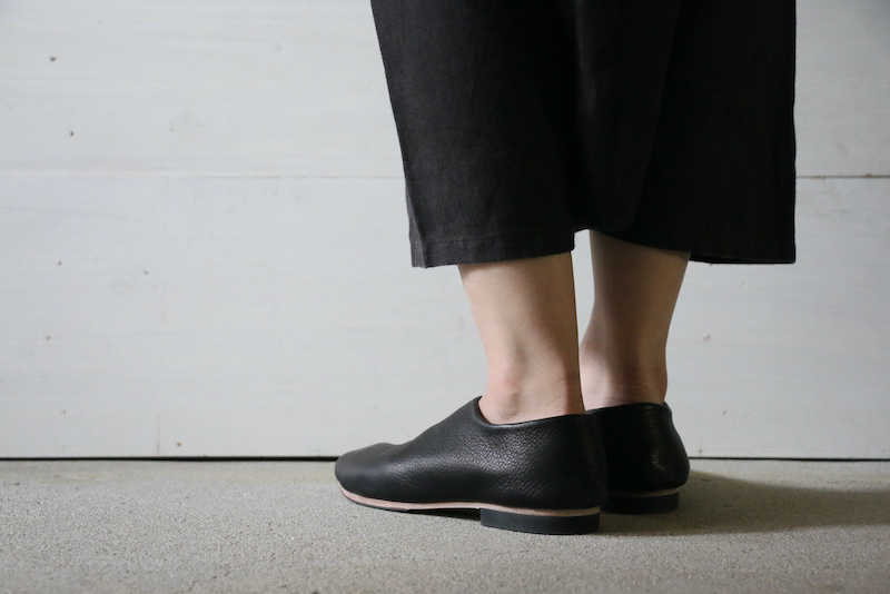 1枚の革で覆われたアッパーのデザインは、内側の土踏まずから踵にかけて、緩やかな曲線を描きます。内側に折り畳まれたアッパーの切り口。縫い目のないその線はあいまいで、穏やかな印象になるように。これは柔らかく、しなやかな革の質感を一層ひきたたすための細工。一枚の革を纏う(まとう)。そのシンプルな佇まいを足もとに。