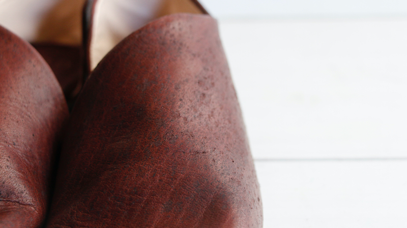 このプロジェクトのための素材選び。アッパー素材を探していました。イメージは「そよぐ風」。マットなスムースレザー、革の繊維に少し空気を孕んだ、ふわりとした肌触り。たどり着いた先は「ポルティラ」と呼ばれる、人にも環境にも優しい革でした。
