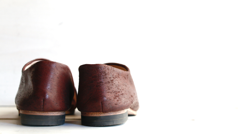 1枚の革で覆われたアッパーのデザインは、内側の土踏まずから踵にかけて、緩やかな曲線を描きます。内側に折り畳まれたアッパーの切り口。縫い目のないその線はあいまいで、穏やかな印象になるように。これは柔らかく、しなやかな革の質感を一層ひきたたすための細工。一枚の革を纏う(まとう)。そのシンプルな佇まいを足もとに。