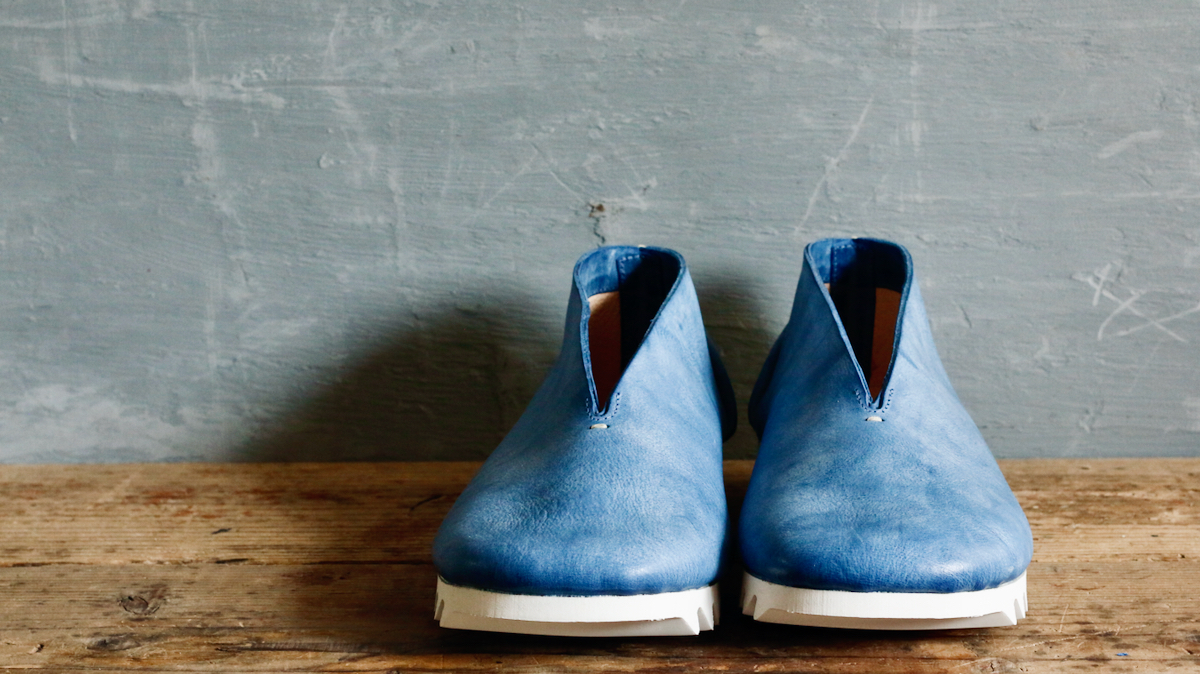 デザインの要は、1枚の革で作られたアッパー。つま先から甲までのミニマルなデザイン。そこに相対するようにある、折り畳まれた、かかとの膨らみが、デザインにスパイスを与えます。